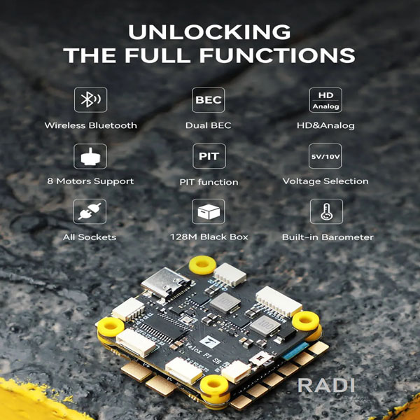 Benar di unlcok semuanya, mulai dari penggunaan Bluetooth, Dual Bec 5V-9V dan 12V , Dual OSD Analog dan Digital, support 8 Motor, PIT mode terbuka, Bisa pilih Voltase 5V atau 12V dari OSD, Barometer sudah builtin, semua pakai Soket dan Black Box 128MB untuk Gyro dan catatatn lainnya.