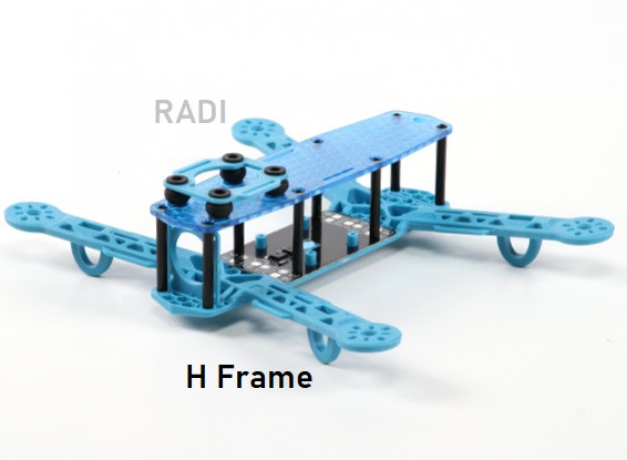 - H-frame (berbentuk huruf H) adalah gaya desain quadcopter kuno lainnya. Dalam quad H, lengan diposisikan di depan gerbong gaya “bus” yang panjang. dewasa ini , H quad tidak lagi disukai karena ukurannya yang besar dan konfigurasinya yang canggung contoh Frame DJI FPV pertama.