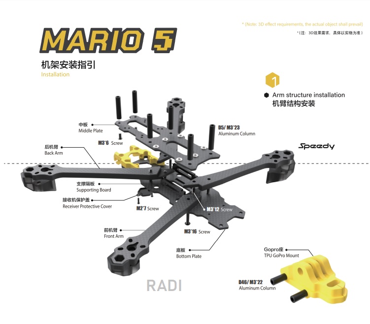 Contoh buku petunjuk perakitan frame mario 5 dari Speedybee, penjelasan bagiannya untuk frame freestyle DC