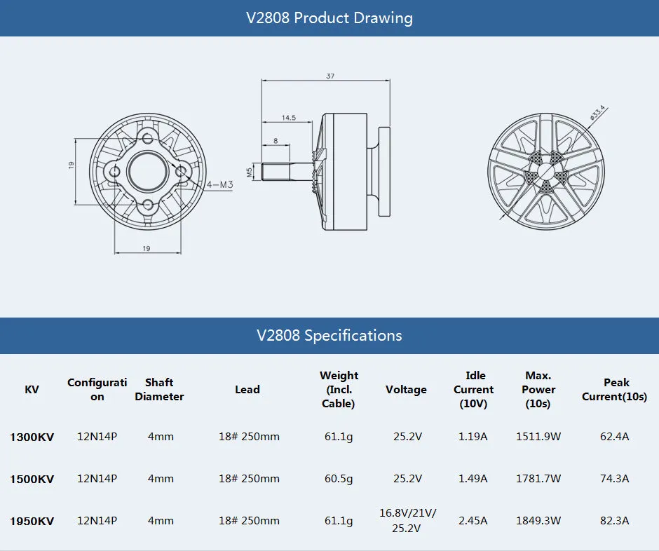 Berikut bagian-bagian penting dari sebuah struktur motor atau dinamo drone seperti pada gambar yang kami peroleh dari T-Hobby yang sebelumnya bernama T-Motor, Jenis motor ini adalah Veloc / Velox 2808 terdiri atas 1300KV, 1500KV dan 1950KV, motor sangat populer dipakai untuk terbang jauh (Long Range) dan Cinematik karena senyap dan kuat mengangkut beban yang besar, perhatikan daya dorong (Thurst) pada gambar ke 3