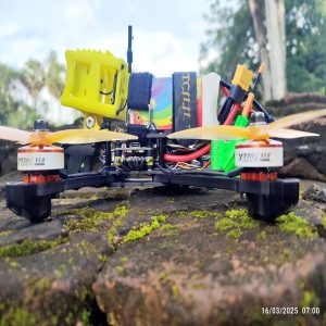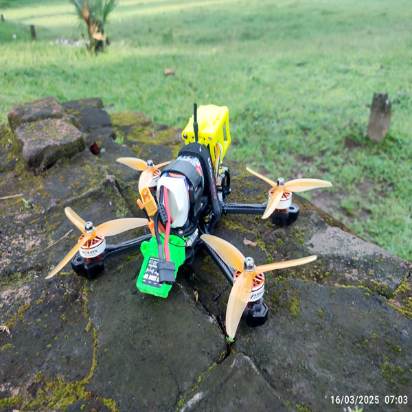 Drone rakitan ini sangat stabil bisa diajak longrange dengan motor super hemat dikelasnya velox 2306 1500KV dari T-hobby, dipasangkan dengan VTX dji O4 lite jarak 1km 1.5km masih 60mbps dengan altitude 40m dan Monitor Goggle 3. Power bisa diatur dari 25MW hingga 700MW